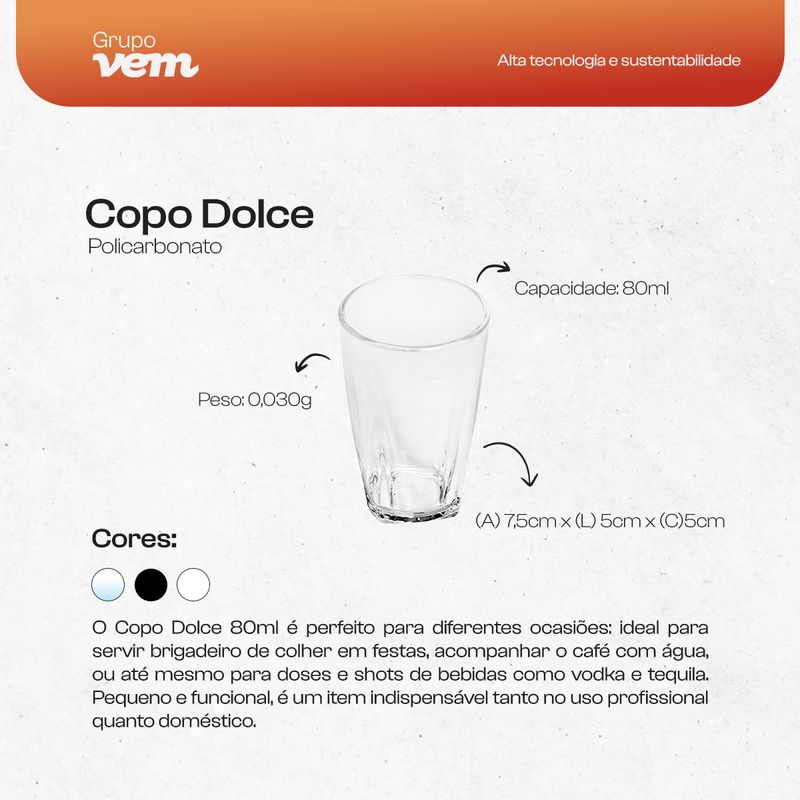 Copo Dolce 80ml é perfeito para diferentes ocasiões: ideal para servir brigadeiro de colher em festas, acompanhar o café com água, ou até mesmo para doses e shots de bebidas como vodka e tequila. Pequeno e funcional, é um item indispensável tanto no uso profissional quanto doméstico.