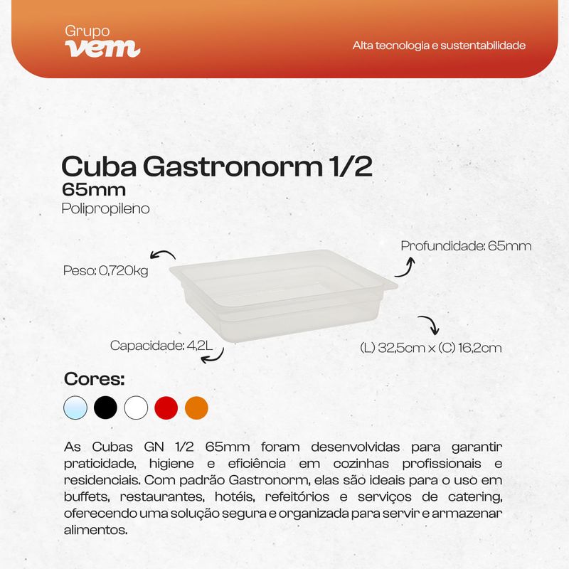 CONTÉM:1 Cuba Gastronorm 1/2 65mm Branca em Polipropileno